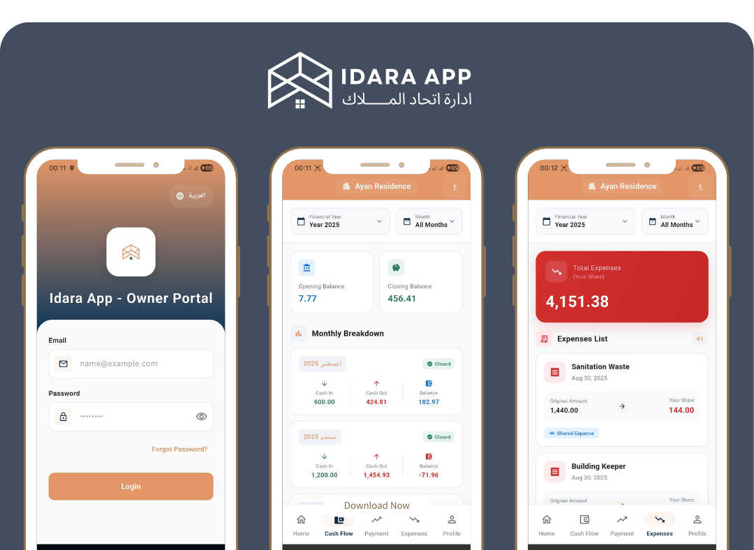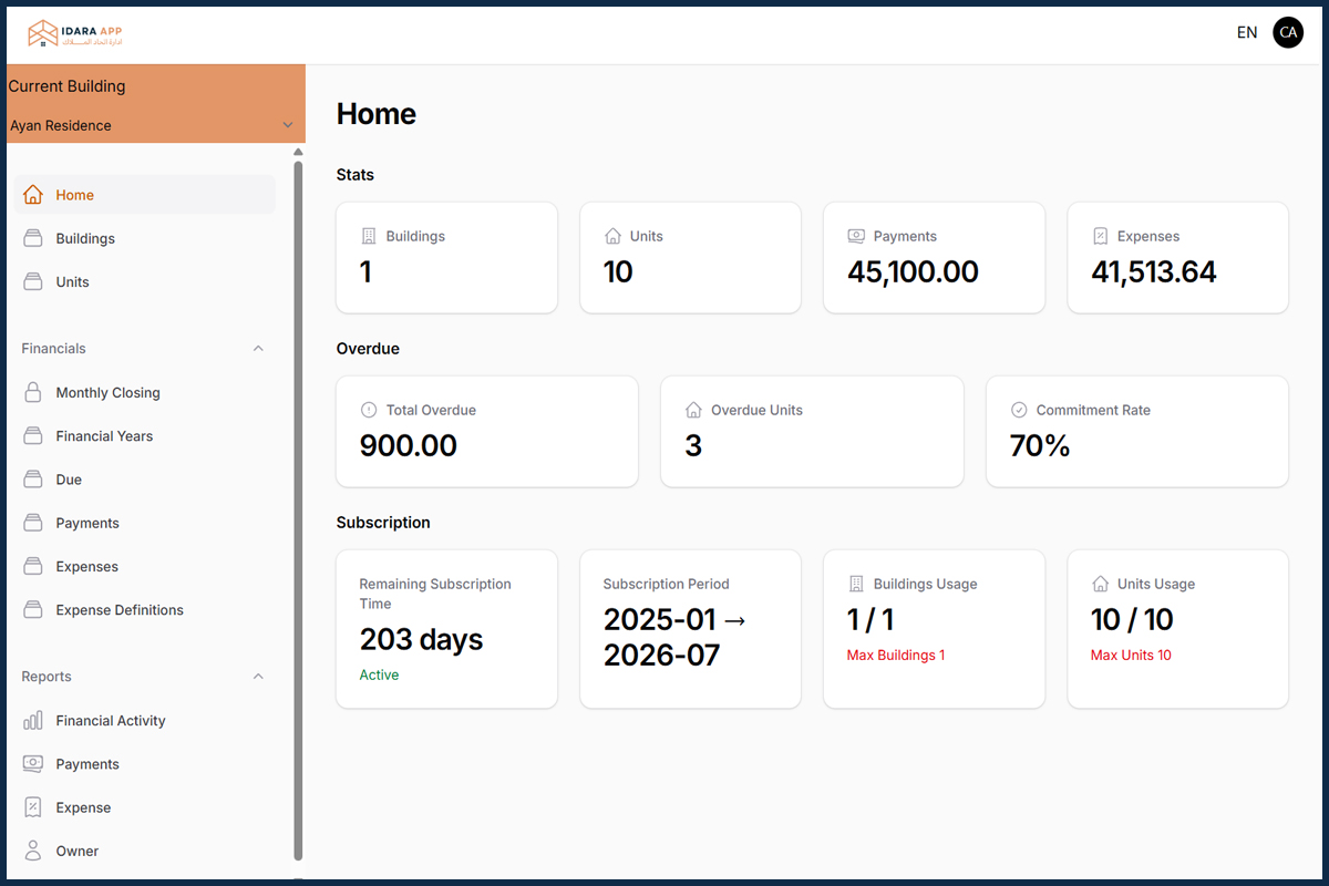 A dedicated owner app connected directly to the system via API. Owners can easily track units, dues, and payments without accessing the web dashboard.